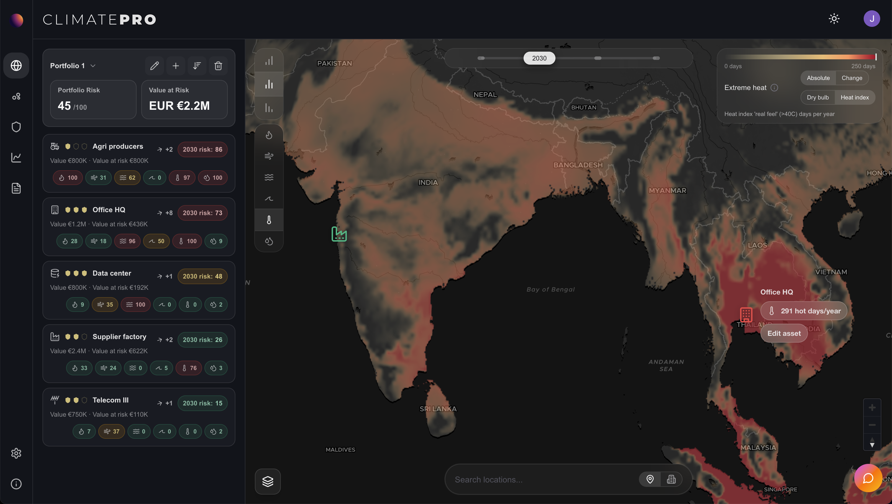 Understand how physical risks affect your portfolio in different regions and climate scenarios.